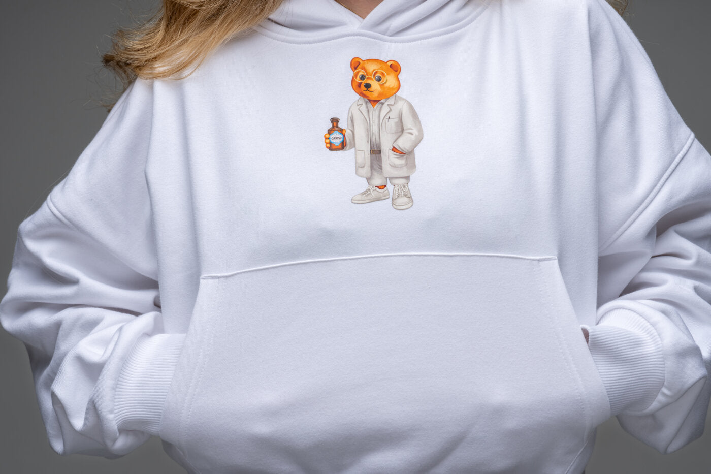 Cropped Hoodie - Der exklusive Hoodie aus der Zusammenarbeit von Carish und Baron Filou vereint pharmazeutische Identität mit Streetwear-Design. Im Mittelpunkt: der gebrandete Apothekerbär, der Kompetenz, Vertrauen und Charakter mit einem Augenzwinkern transportiert.