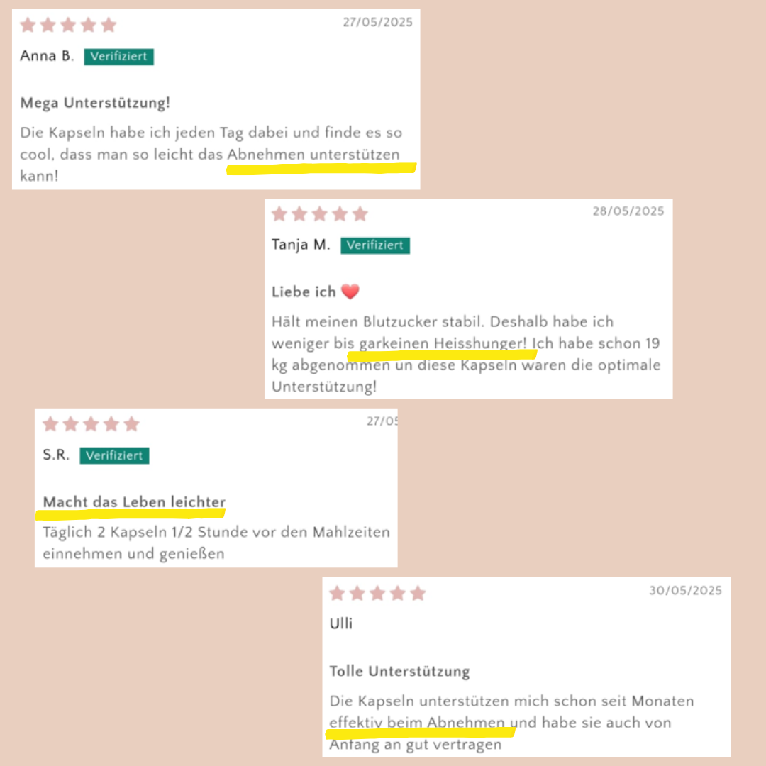 Habe die Kapselni in der Summer Body Gruppe getestet und seither nachbestellt. Hätte es nicht gedacht, aber es wirkt wirklich - kein Heißhunger oder arge Süßgelüste mehr.